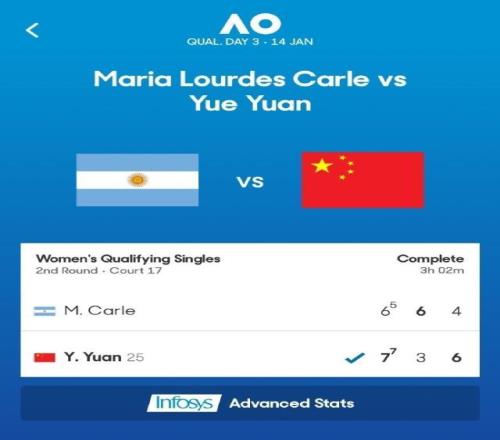 袁悅鏖戰(zhàn)3小時(shí)以2比1戰(zhàn)勝卡萊,晉級(jí)澳網(wǎng)女單資格賽決勝輪