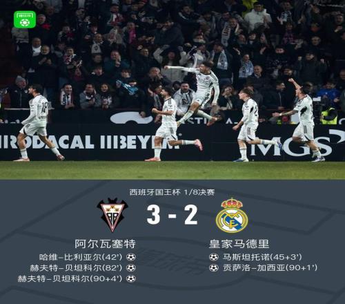 北京時(shí)間1月15日西班牙國(guó)王杯 1/8決賽,阿爾瓦塞特對(duì)陣皇家馬德里。上半場(chǎng),比利亞爾率先破門(mén)。赫伊森頭球被撲出,馬斯坦托諾補(bǔ)射扳平比分。下半場(chǎng),貝坦科爾破門(mén)幫助主隊(duì)再次領(lǐng)先。居萊爾開(kāi)出角球,貢薩洛頭球再次扳平比分,不過(guò)隨后貝坦科爾完成絕殺。全場(chǎng)比賽結(jié)束,皇馬2-3不敵阿爾瓦塞特,被對(duì)手淘汰出國(guó)王杯。
