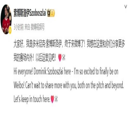 索博寫道:“大家好,我是多米尼克-索博斯洛伊,終于來微博了!我想在這里和你們分享更多我的賽場內(nèi)外!以后這里見吧!???”